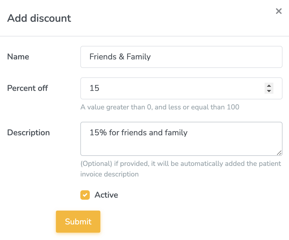 The first step is for the clinic manager to set up predetermined discounts that can be applied to a patient invoice. To do so, the clinic manager can go to Billing > Settings > Discounts, and then click on Add discount.